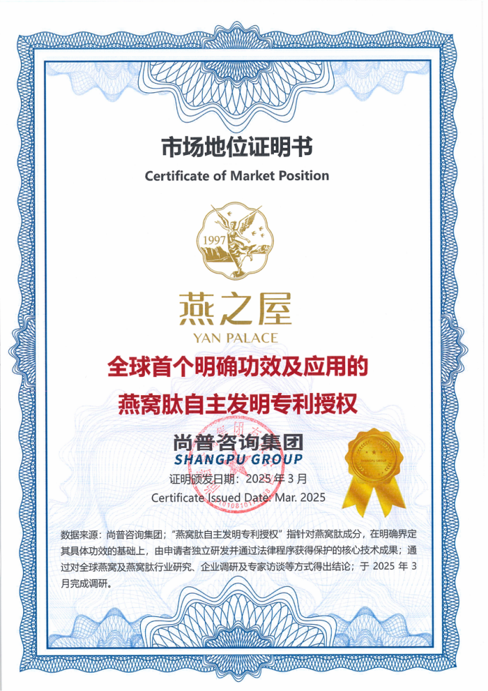圖:燕之屋獲得“全球首個明確功效及應(yīng)用的燕窩肽自主發(fā)明專利授權(quán)”認(rèn)證